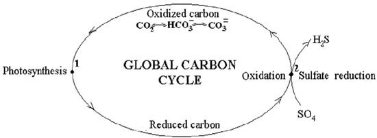 As early as 1926, the famous Russian naturalist Vladimir Vernadsky put forward an idea on the interaction and interconditionality of the biosphere and geological processes. Developing and concretizing his idea, we have suggested a model of the global cycle of biosphere carbon [1,2]. According to the proposed model, carbon transformations occur along a closed loop. In the course of it, the completely oxidized state in the natural “carbon dioxide—bicarbonate—carbonate “ system transforms into a reduced state that arises during photosynthesis and the subsequent transformations, including those occurring in the earth’s crust after the burial of the “living” matter and its transition into sedimentary organic forms. The reverse transition into the initial completely oxidized state carbon makes in the subduction zone, where sedimentary organic matter is oxidized to CO2, thus ending the redox transformations in the loop (Figure 1).