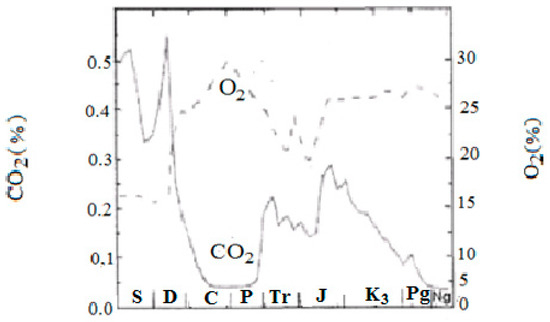 Anti-phase character of changes in the CO2 substrate (solid line) and the O2 product (dashed line) of the photosynthesis reaction in the Phanerozoic epoch based on the calculation of the results using the Geocarb III model (Reprinted with permission from [5]. Copyright 2006 Photosynthesis Research.