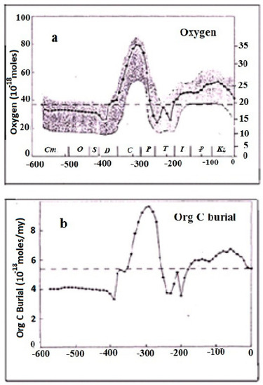 Noting that fluctuations of oxygen concentrations in the environment are identical to the fluctuations of the O2/CO2 concentration ratio or its analog Vo/Vc (the ratio of oxygenase Vo to carboxylase Vc activity of Rubisco in photosynthesizing organisms), Igamberdiev and [5] have compared the fluctuations of the variables with the changes of biodiversity rate in the course of geological time for land plant families (Figure 9). They found full coherence of all curves.