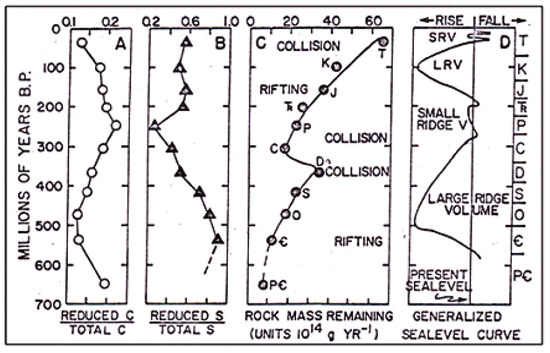 Curve C describes the geological variable presented by the relative change in the mass of sedimentary rocks for some conventional unit of geological time. The curve discloses the link between the sedimentary rock mass, preserved with tectonic plate movements and major continental plate collisions, and active rifting [18].