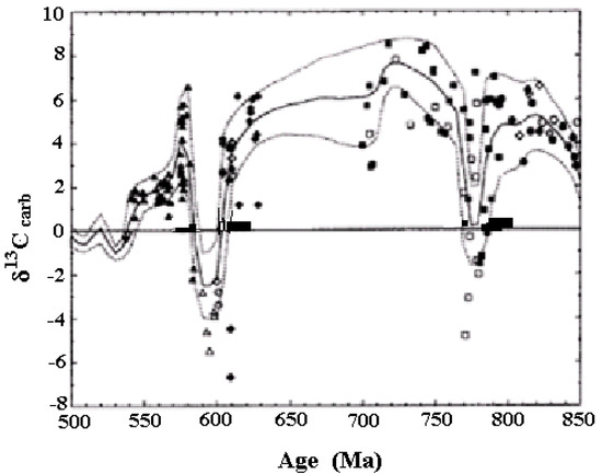 Secular variations of ԑ13C marine carbonates in the Late Proterozoic. Samples were taken from various stratigraphic groups (Reprinted with permission from Ref. [24]. Copyright 1992 Geochimica et Cosmochimica Acta).