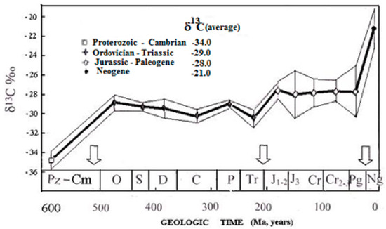 Accordingly, the accumulation of organic matter in the Earth’s crust began to decrease, which occurred synchronously with an increase in the oxygen content in the atmosphere. As already mentioned, the predominance of the assimilation component in global photosynthesis entails the enrichment of carbon of organic matter with the isotope 12C, while the predominance of the photorespiratory component leads to the enrichment of organic matter with the isotope 13C. The described mechanism of accumulation of sedimentary organic matter in the Earth’s crust and oxygen in the atmosphere is reflected in the observed isotopic enrichment of carbon of sedimentary organic matter in isotope 13C with time [15].