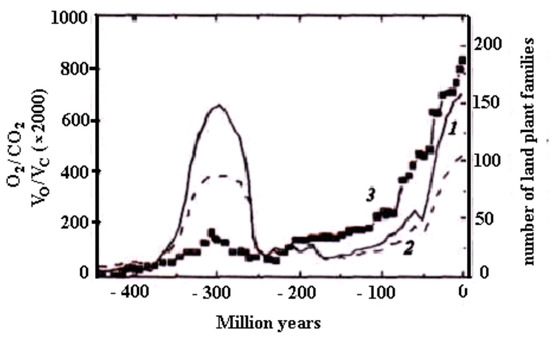 The correlation between biodiversity rates and the variations of the CO2/O2 concentration ratio in the atmosphere (or its analog Vo/Vc) in the course of geological time. The temporal changes (Reprinted with permission from Ref. [22]. Copyright 2006 Photosynthesis Research) of the CO2/O2 ratio in the atmosphere, in Phanerozoic (1), the ratio of carboxylase and oxygenase activity of Rubisco taking into account temperature (2) and the number of terrestrial plants appearing in the Phanerozoic (3).