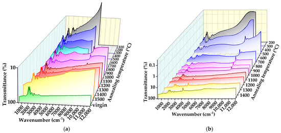 Figure 1 displays how the optical transmission spectrum evolves with annealing temperature Tan for the samples D1 and D3, which became opaque in the visible range after irradiation but partially transparent in the IR range. Particularly, for the sample D3, the transmission at 10,000 cm−1 (λ = 1000 nm) was 0.015% immediately after irradiation, and it increased to 0.035% after annealing at 200 °C (Figure 1b), corresponding to the absorption coefficients of 200 and 150 cm−1, respectively.