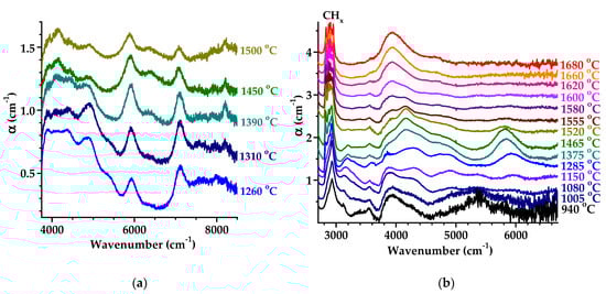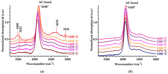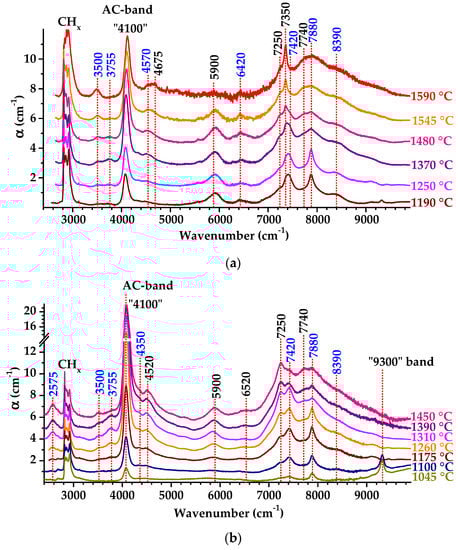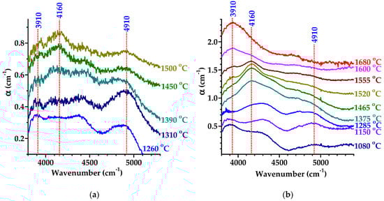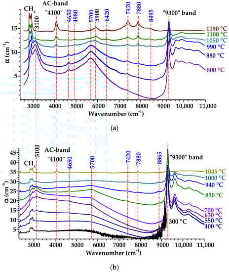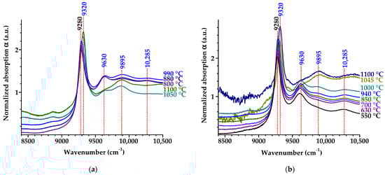 The 9300 cm−1 band, another strong feature in the spectrum (Figure 3b), also demonstrates the annealing-induced blue shift from 9277 to 9318 cm−1 (Figure 2b). We note that a number of lines, with some of them being rather intensive, are detected in the spectra in the range of 7000 to 9000 cm−1 (as indicated in Figure 3a,b); however, we were not able to reveal meaningful trends in the intensity ratio between them or with respect to the 4100 and 9300 cm−1 bands with the annealing temperature.
