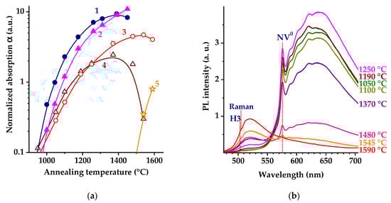 The dynamics of the PL spectra of D1 with annealing (Figure 5b) confirm the formation of A-centers: the emission intensity of neutral nitrogen vacancy NV0 with a ZPL at 575 nm decreases, while the intensity of the H3 center (two nitrogen atoms coupled to a vacancy) with a ZPL at 503 nm increases, indicating nitrogen aggregation. In addition to the 4165 and 4941 cm−1 bands, there are other spectral features, such as the 4670 cm−1 (0.579 eV) band appearing at Tan = 1590 °C (Figure 4a); with similar trends with annealing, they appear synchronously with A-center formation. In this spectral range in natural diamond with a deformation-related color, a band at 4673 cm−1 is known, which was associated with ACs at 4165 cm−1 [23]. For sample D1, we observe the appearance and enhancement of the 7350 cm−1 (0.911 eV) band, again synchronously with A-center formation.
