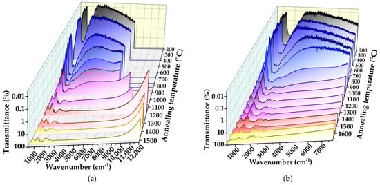 Transformations of IR transmittance spectra vs. annealing temperature for samples D1 irradiated with neutrons with fluence F = 1 × 1018 cm−2 (a) and D3 with F = 3 × 1018 cm−2 (b).