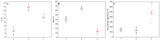 Soil (A) temperature and (B) moisture (SWC) and (C) CO2 emission (C) in the studied (1) palsa, (2) bog and (3) forest ecosystems. Averages, standard errors of the mean and outliers are shown.