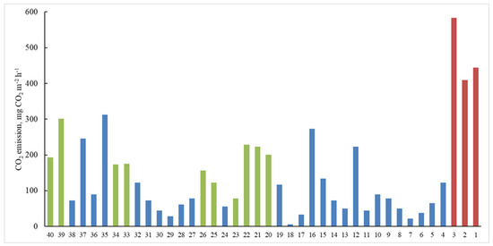 CO2 emission on the transect. Red color—forest points, blue color—bog, green color—palsa; the numbers show the sampling points.