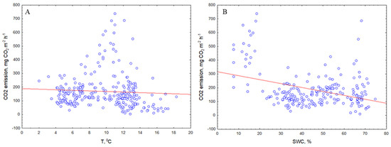 Correlation of CO2 emission with topsoil (A) temperature and (B) moisture (SWC) for all sampling points.