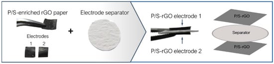Finally, selected P/S-rGO paper samples (prepared at 150 °C) had their electrochemical behavior evaluated. Electrodes containing the selected samples were built as shown in Figure 1. Aiming to evaluate the influence of phosphorus-containing groups on the electrochemical behavior of the studied samples, the electrochemical analyses were also conducted using an rGO sample (treated at 150 °C) prepared from a GO sample that had been synthesized by a modified Hummers method. This latter sample, labeled as GOH_150, was prepared in the same way as the other rGO samples, but without the addition of phosphoric acid during the synthesis (see Supplementary Information).