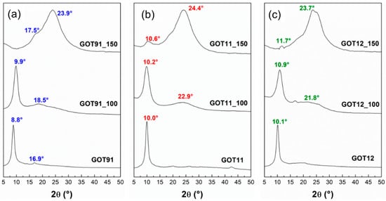X-ray diffractograms of the (a) GOT91, (b) GOT11 and (c) GOT12 samples as prepared and after the thermal reduction treatments performed at 100 and 150 °C.