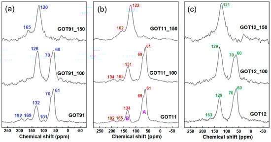 Solid-state 13C NMR spectra of the (a) GOT91, (b) GOT11 and (c) GOT12 samples as prepared and after the thermal reduction treatments performed at 100 and 150 °C.