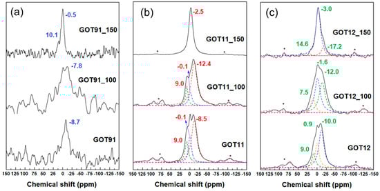It is worth observing that the most significant changes of the phosphate species only occur after the treatment at 150 °C. The first notable aspect of the 31P NMR spectra of the thermally reduced samples is the difference in the signal-to-noise ratio of the spectrum of the GOT91_150 sample compared to the GOT11_150 and GOT12_150 samples, which is due to the much larger P content of these two latter samples, as indicated by the XRF results (Table 1). Therefore, it is possible to note the similarity between the profiles of the 31P NMR spectra of these samples (GOT11_150 and GOT12_150), exhibiting a main peak around −3.0 ppm, associated with orthophosphoric acid. It is interesting to note the tendency of a slight shift of the peaks closer to 0 ppm to lower chemical shifts with increasing thermal treatment temperature, which can be attributed once more to the increase in the effects associated with the electrical conductivity and the diamagnetic susceptibility of the graphene layers in these samples, as already reported in studies involving chemically activated carbons [].