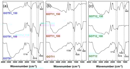 FTIR spectra of the (a) GOT91, (b) GOT11 and (c) GOT12 samples as prepared and after the thermal reduction treatments performed at 100 and 150 °C.