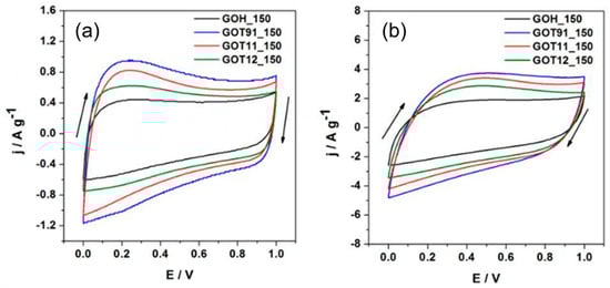 Figure 6 shows the cyclic voltammograms of the P/S-rGO and GOH_150 samples obtained at 10 mV s−1 (Figure 6a) and 50 mV s−1 (Figure 6b). All samples exhibited a quasi-rectangular shape voltammogram, even at a high scan rate, demonstrating a good capacitive behavior of the samples. In addition, a very good electrochemical stability of the electrolyte at high potentials was observed, with no current increment related to oxygen evolution being observed even up to 1 V. The P/S-rGO samples showed higher current densities than the GOH_150 sample, which points to a higher Cs for the phosphorous-containing samples. In the voltammograms obtained at low scan rate (Figure 6a), it can be seen that the P/S-rGO hybrid samples exhibited a broad peak between 0.1 and 0.4 V, suggesting a pseudocapacitive contribution reaction that could be linked to the oxygenated and/or phosphorus-rich surface functional groups present in these samples [].
