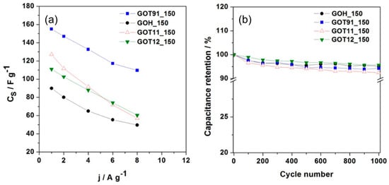 The Cs values were determined from the galvanostatic charge–discharge curves according to Equation (1); their dependence on the current density is shown in Figure 7a. For all current density ranges, the P/S-rGO samples presented higher Cs values than the GOH_150 sample. The best behavior was obtained for the GOT91_150 sample, which reached values up to 155 and 110 F g−1 at 1 and 8 A g−1, respectively. These values are similar to those reported in the literature for other carbon-based materials [,,,].