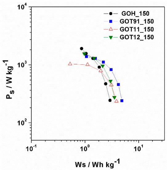 In these expressions, Cs is the specific capacitance of one electrode (F g−1), E2 is the voltage range during the galvanostatic discharge (V), and td is the discharge time (s). Figure 9 shows the Ragone plots obtained for the rGO samples. At low Ps values, the highest Ws value was achieved for the GOT91_150 sample (4.9 Wh kg−1 at 238.7 W), while the lowest one corresponded to the GOH_150 sample, which is in accordance with the Cs values obtained for these samples (i.e., the sample with the higher Cs reached the higher Ws value). On the other hand, for all the samples, as Ps increases, the Ws values decrease. This behavior is particularly noticeable for the GOT11_150 sample, which is consistent with its higher ESR (Figure S7, Supplementary Material) and relatively low rate capability (Figure 8a).
