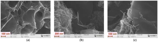 Figure 2 reveals the porous morphology of the carbon cryogels. Both CNPs seem well dispersed in the carbon matrix. The thermal treatment certainly reduces the GO that is incorporated into the carbon framework in the typical sheet-like form (Figure 2b). Similarly, CNTs added to the carbon cryogel kept their tubular shape (Figure 2c).