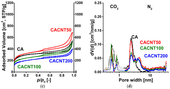 ι-carrageenan powder and urea pearls (98%) were purchased from Sigma Aldrich (Budapest, Hungary). The aqueous GO suspension (0.96 wt%) was prepared from natural graphite (Graphite Týn, Týn nad Vltavou, Czech Republic) following an improved Hummers’ method [30,31]. The MWCNT was obtained from Chengdu Organic Chemicals Co., Ltd. (Chengdu, China). The as-received CNTs were oxidized in cc. HNO3 (65%) for 3 h at 80 °C, washed with aqueous NaOH and reprotonated with 1.0 M HCl before use [32]. All other chemicals were used without further purification. Hydrogel matrices were obtained by mixing 2 g urea and 2 g ι-carrageenan with a 100 mL aqueous CNP suspension (containing 50, 100 and 200 mg of the corresponding nanoparticles, respectively) at 80 °C. The freeze-dried polymer cryogels were pyrolyzed in a rotary quartz reactor at 700 °C (20 °C/min) in dry N2 flow (25 L/h) for 1 h. The remaining inorganic impurities were removed by washing with 1.0 M HCl prior to annealing in Ar flow for 1 h at 1000 °C. The dry polymer and carbon cryogels were labelled PA and CA, respectively. The sample labels also refer to the incorporated CNP (as GO or CNT) and their incorporated mass (50, 100 or 200), respectively. CNP-free polymer and carbon gels were prepared for comparison [28].