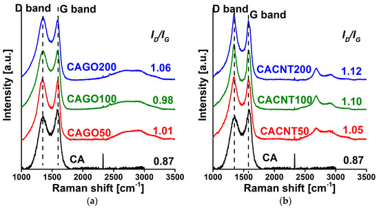 Raman spectra of the GO- (a) and CNT- (b) doped carbons.