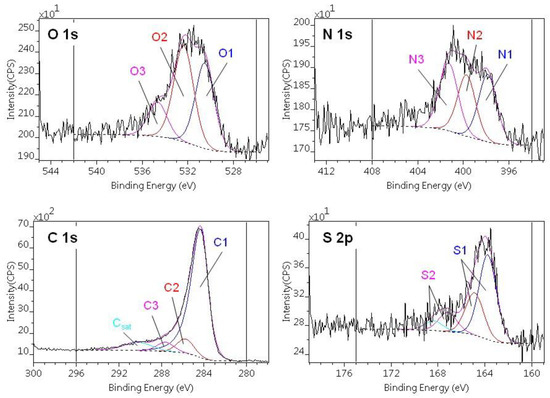 Figure 5 shows an example of the composite photoelectron lines (C1s, O1s, N1s and S2p) and their decomposition into the different chemical states. The binding energy ranges of the various states and their concentration are listed in Table 3 and Table 4. Three different states of carbon, oxygen and nitrogen and two states of sulfur were distinguished in all the samples.
