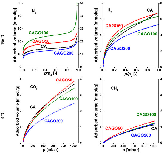 The potential of these carbons in gas separation was based on single gas adsorption measurements. The N2, CO2, H2 and CH4 adsorption isotherms of the various GO-doped carbon samples are presented in Figure 7. For easier comparison, only the adsorption branches are plotted and the gas uptakes are expressed in mmol/g. It should be noted that the effect of the incorporated GO varies from adsorbate to adsorbate. Incorporation of GO in the early stage of the synthesis affects not only the gel formation, but even more the porous texture and the surface chemistry in a sophisticated way. On comparing the N2 and H2 uptakes at −196.15 °C, it is clear that all the samples adsorb significantly more N2 than H2, as the boiling point of H2, −252.9 °C, is much lower than the temperature of the uptake measurements. The almost tenfold difference indicates the potential of these carbon samples for N2/H2 separation at the temperature of these measurements. It is known that narrow micropores decorated with oxygen and nitrogen functional groups enhance CO2 uptake [22]. The isotherms of CO2 and CH4 adsorption (0 °C) show that all samples adsorb more than twice as much CO2 as CH4 and CAGO50 attains the highest uptake for both gases at atmospheric pressure. This could indicate the potential of the GO-doped samples for CO2/CH4 separation.