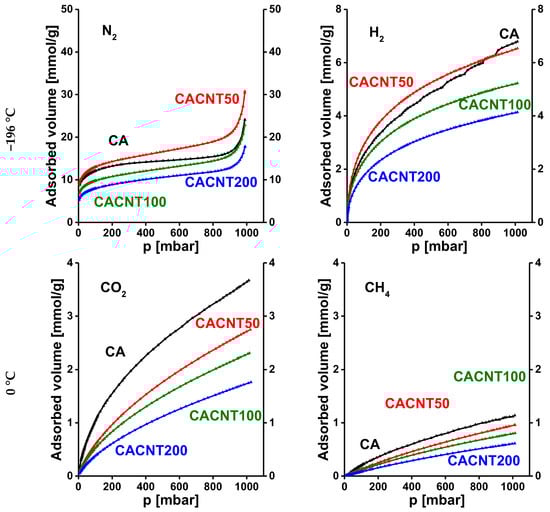 Similarly, Figure 8 presents the N2, H2, CO2 and CH4 adsorption isotherms of the annealed CNT-doped carbons. Here, the sequence of the overall uptakes is similar at the two temperatures, respectively. Generally, the CNT-doped samples display a poorer adsorption performance (proportional to the incorporated CNT) than the undoped CA carbon. Only sample CACNT50 has somewhat higher uptakes for both gases measured at −196.15 °C.