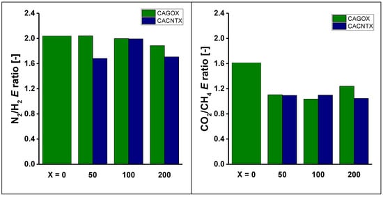 The relative interactions were characterized by the ratio of the corresponding characteristic energies derived from the DR slopes and by the ratio of the KH values (Figure 9 and Figure 10). Comparison of the DR interactions reveals that the energy ratio governing the N2/H2 separation is higher than that of the CO2/CH4 separation. The addition of the nanoparticles does not enhance the energy ratios, but leads to a ca. 25% loss in the case of CO2/CH4 separation.