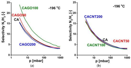 N2/H2 selectivity curves of GO-doped carbons (a) and CNT-doped carbons (b).