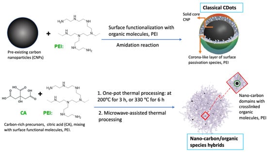 - Liang, W.; Sonkar, S.K.; Saini, D.; Sheriff, K.; Singh, B.; Yang, L.; Wang, P.; Sun, Y.-P. Carbon Dots: Classically Defined versus Organic Hybrids on Shared Properties, Divergences, and Myths. Small 2023, 19, 2206680. [Google Scholar] [CrossRef] [PubMed]