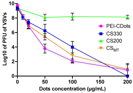 - Adcock, A.F.; Wang, P.; Ferguson, I.S.; Obu, S.C.; Sun, Y.-P.; Yang, L. Inactivation of Vesicular Stomatitis Virus with Light-Activated Carbon Dots and Mechanistic Implications. ACS Appl. Bio Mater. 2022, 5, 3158–3166. [Google Scholar] [CrossRef] [PubMed]