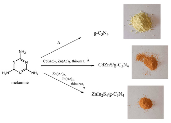 Synthesis of g-C3N4 structures was carried out by decomposition of melamine at the temperature of 550 °C. CdZnS/g-C3N4 and ZnIn2S4/g-C3N4 heterostructures were synthesized from melamine and the mixture of acetates of these metals in excess of thiourea as a source of sulfur (Figure 1).