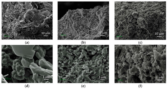SEM images of the samples obtained at ×1000 (a–c) and ×10,000 (d–f) magnification: (a,d) g-C3N4; (b,e) CdZnS/g-C3N4; (c,f) ZnIn2S4/g-C3N4.