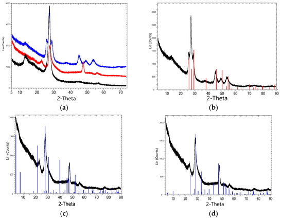 Experimental PXRD powder diffraction patterns: (a) the g-C3N4 (black curve), CdZnS/g-C3N4 (blue curve) and ZnIn2S4/g-C3N4 (red curve) samples. The curves were shifted relative to each other along the intensity axis for visual clarity; (b) the heterostructure of CdZnS/g-C3N4 type, the interference peaks corresponding to the crystalline form of Zn0.5Cd0.5S (Ref.No. 01-089-2943) are shown by red vertical dashes; (c,d) the heterostructure of ZnIn2S4/g-C3N4 type, the interference peaks corresponding to the crystalline form of In2ZnS4 (Ref.No. 03-065-2023) (c) and Zn3(In2S6) (Ref.No. 01-080-0835) (d) are shown by blue vertical dashes.