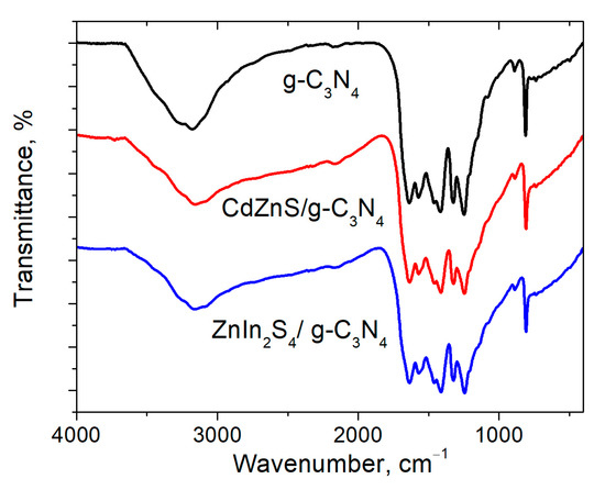 On the FTIR spectra, all the samples exhibit absorption peaks that are characteristic of the g-C3N4 structures (Figure 4). The broad band at 3000–3300 cm−1 can be attributed to stretching vibrations of the N–H bond and residual surface amine and hydroxyl groups. Intense bands in the range of 1200–1650 cm−1 can be attributed to the C–N bonds of the heterocyclic ring. A narrow peak at 808 cm−1 corresponds to bending vibrations of triazine units. Similar absorption bands in the FTIR spectra of the CdZnS/g-C3N4 and ZnIn2S4/g-C3N4 heterostructures indicate the presence of a well-formed g-C3N4 phase in these samples.