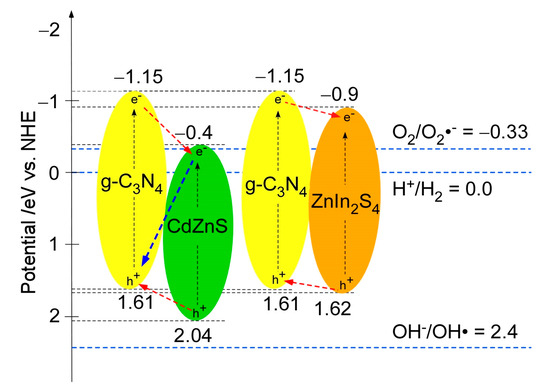 In the CdZnS/g-C3N4 heterostructures, the levels of the individual components are more substantially shifted from each other as compared with the ZnIn2S4/g-C3N4 sample. Therefore, two pathways of charge separation are possible. The first one is a type II transition of the charge carriers from one material to another that provides their free energy reduction (Figure 7, red arrows). Another possible option is recombination of photoexcited electrons from a low-energy CdZnS with the g-C3N4 holes (Figure 7, blue arrow). In this case, charge carriers with higher redox properties are involved in the photocatalytic process (Z-scheme).