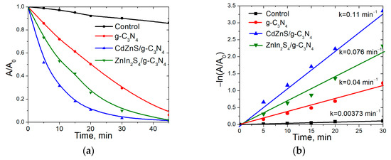 Experimental results show that the photocatalytic properties of heterostructures are significantly better than those of pure g-C3N4 (Figure 8a). According to the calculated values, the RhB decomposition rate constant in the presence of ZnIn2S4/g-C3N4 and CdZnS/g-C3N4 was almost 2- and 3-fold higher, respectively, than the rate constant in presence of pure g-C3N4 (Figure 8b).
