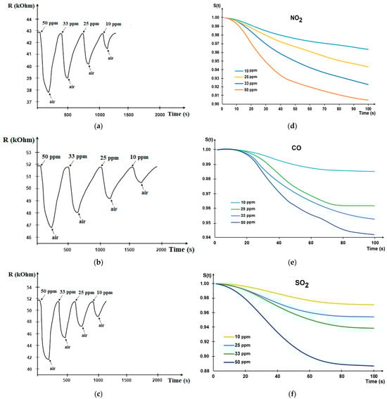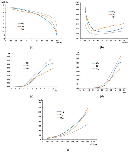 | Elovich (in the range from the minimum of the first derivative to the maximum of the second derivative of the sensor response) | SO2 | Y = 0.0435 X − 0.1281 | 0.9995 | 0.00088 | 0.00202 |
