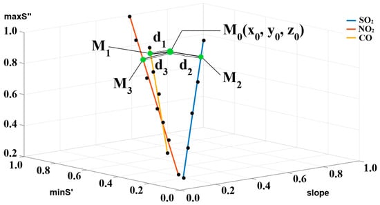 - normalization of the values of the informative features by the maximum value and construction of straight lines characterizing gas in the space of informative features, using the method of least squares in space;