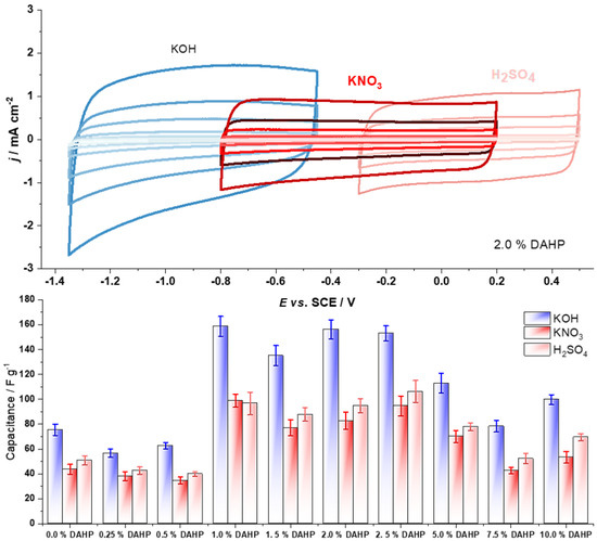 First, we present the results of the capacitance measurements. Figure 1 (top row) shows the capacitive responses of the DAHP-2.0 sample in three different electrolytes. As we have used the SCE electrode as a reference electrode, the potential window in which cycling was performed is shifted to higher potentials as the pH of the electrolytic solution decreases. It is clear that the capacitive response is nearly rectangular in shape, without significant features like voltammetry peaks that would indicate pseudo-faradaic or faradic behavior. The overall capacitive response considering the different electrolytic solutions increases in the following order: KNO3 ≈< H2SO4 < KOH. Such a trend is clearly seen from the comparison of the specific capacitances measured for the entire series at a common potential sweep rate of 100 mV s−1 (Figure 1, bottom row). Overall, considering the capacitances measured at 100 mV s−1, for the entire series, the values range between 35 and 160 F g−1, demonstrating a great variety of the capacitive properties of the studied materials. This result is not overly surprising, considering that the chemical composition and the textural properties of the studied carbon materials also vary to a significant extent. However, while the properties of the studied carbons change progressively with the amount of DAHP used in the synthesis, the capacitive properties do not show such a trend, and the capacitance is maximized for the samples prepared with a relatively low amount of impregnating agent (1.0% to 2.5%).