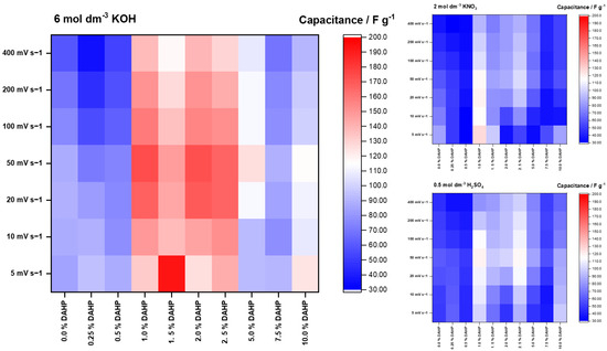 Heatmaps for measured capacitances in three different solutions, as indicated in the plots. The potential sweep rate was between 5 and 400 mV s−1. The color map and the scale are the same for all three electrolytes, which clearly shows that the capacitances are the highest in the 6 mol dm−3 KOH solution.