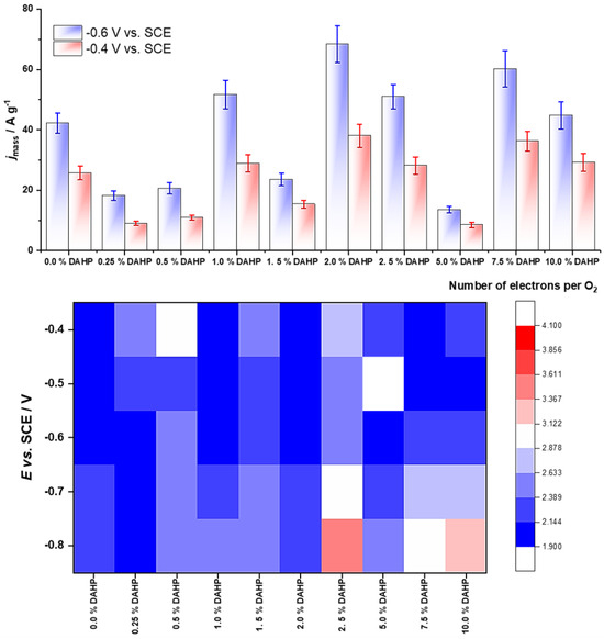 Top row—ORR mass activities of investigated samples at −0.4 and −0.6 V vs. SCE, calculated from the anodic scan; bottom row—number of electrons consumed per O2 molecule, in the potential range −0.4 to −0.8 V vs. SCE.