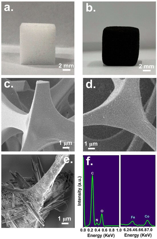 Because MCF was derived from the melamine foam, it would be interesting to observe the variation in the bulky appearance from the pristine foam to the MCF. Figure 1 shows the preparation procedure as well as the actual picture of the pristine foam, which was cut to afford a cube with a completely white color. One can also notice that such a pristine foam had the nature of foam with noticeable pores (Figure 2a). After immersing this foam into the Co/Fe-TA mixture, the white foam had become brownish, and the foam was noticeably adorned with fine substances (the inset in Figure 1). Once this brownish foam was further carbonized, it finally became completely black as shown in Figure 2b, suggesting that the pristine foam had changed to a carbonaceous material. In addition, the microscale appearances of these materials are also visualized in Figure 2. Specifically, Figure 2c shows the typical triangular frame of the melamine foam, which exhibited a smooth and clean surface. Nevertheless, once such a pristine foam has been pyrolyzed in an air-lean atmosphere, the triangular frame can still be retained (Figure 2d); however, one can note that the surface of the frame has become coarse with wrinkles, signifying that the carbonized foam (CF) itself can remain intact. Furthermore, after the deposition of Co/Fe-TA on the foam, followed by carbonization, the entire cubic foam remained as a cubic black material as shown in Figure 2b, and microscopically, the triangular framework still remained (Figure 2d); interestingly, many thorn- or needle-like substances were adorned on the frame.