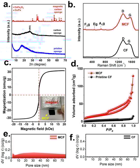(a) XRD patterns; (b) Raman analyses, (c) saturation magnetization of MCF, (d) N2 sorption isotherms, (e,f) pore size distributions of CF and MCF.