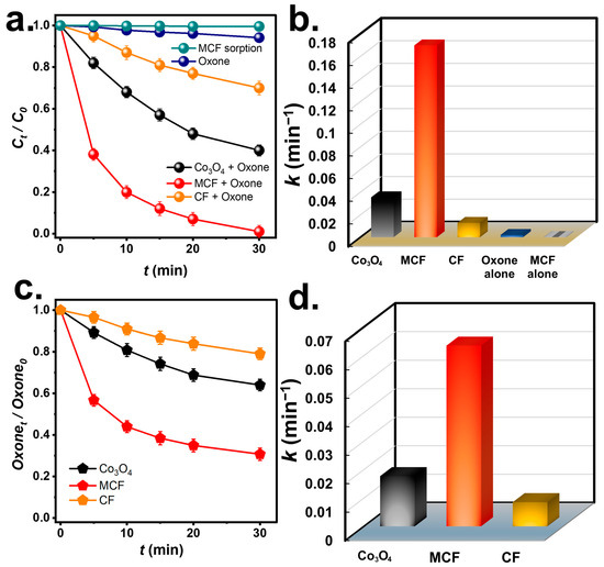 Because the MCF led to the much quicker degradation of the BHPM, it was also essential to probe into how the Oxone was “consumed” by the MCF. In Figure 4c, Oxone consumption during BHPM degradation was inspected. In 30 min, ~70% of Oxone was “consumed” by the MCF, while Oxone consumptions by CF and Co3O4 were substantially lower (33% and 20%, respectively). It was worth comparing the k values of Oxone consumption that are then summarized in Figure 4d. The k using the MCF was 0.063 min−1, the k by CF was 0.009 min−1 and that by Co3O4 was 0.017 min−1, corroborating that the Oxone consumption by the MCF was considerably quicker and more effective than the CF and Co3O4, thereby leading to the quicker BHPM elimination.