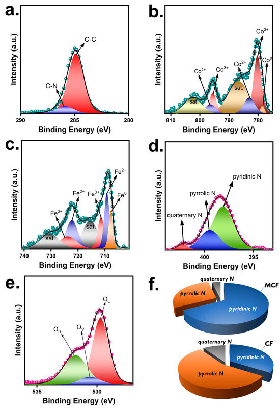 (a–e) XPS analyses of MCF; (f) fractions of N species in MCF and CF.