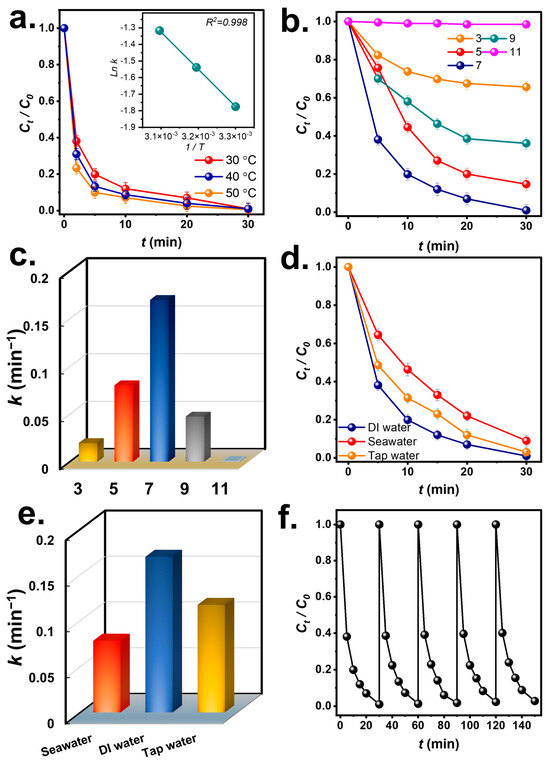 As MCF + Oxone eliminated the BHPM effectively, the temperature and pH would also impact BHPM degradation. Figure 7a shows BHPM removal by MCF + Oxone from 30 to 50 °C. As the temperature rose from 30 to 40 °C, the k value for BHPM degradation rose from 0.170 min−1 to 0.215 min−1. When it increased to 50 °C, the rate constant of BHPM degradation rose to 0.267 min−1, indicating the enhancing effect of elevated temperatures on BHPM elimination. Furthermore, these rate constants at different temperatures were correlated using the Arrhenius equation as follows [36]: