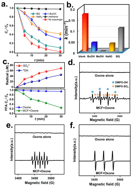 (a) Effects of various inhibitors and (b) corresponding rate constants; ESR analyses: (c) DMPO, (d) DMPO in methanol, (e) TEMP, (f) fractions of ROS; and FFA consumption by MCF + Oxone.
