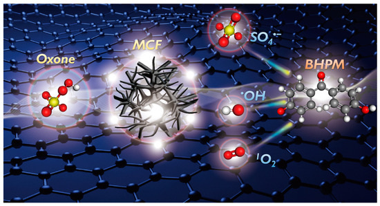 Furthermore, once an alternative spin-trapping agent 2,2,6,6-tetramethylpiperidine (TEMP) was used, no notable signal was seen for Oxone alone. However, after TEMP, Oxone, and MCF were all present, a huge signal was noted and attributed to TEMP-1O2 (Figure 8f), validating the presence of 1O2. Therefore, BHPM degradation can be attributed to SO4•−, •OH, and 1O2 generated from MCF-activated Oxone, as outlined in Figure 9.